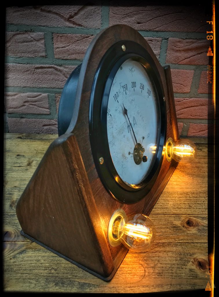 Tischlampe aus altem riesigen Amperemeter mit ca. 22 cm Durchmesser im Holzständer – ein echtes Unikat!